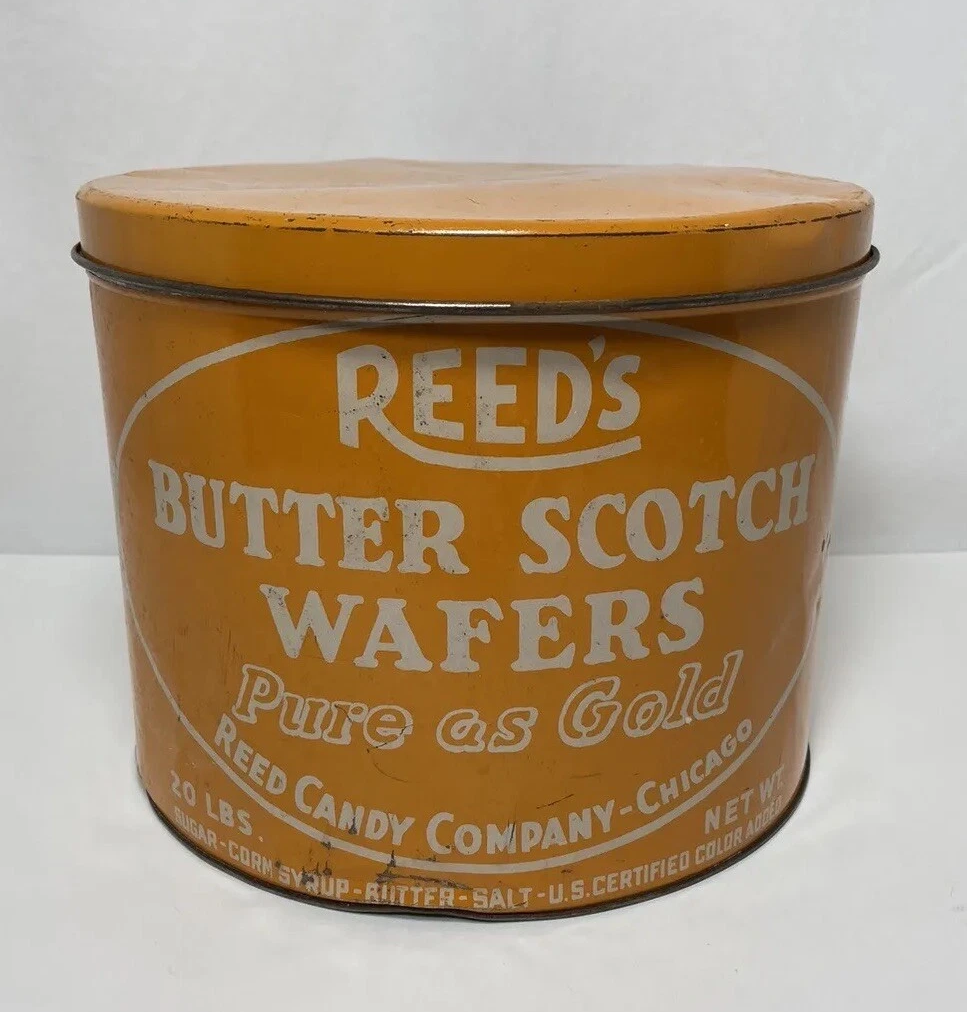 Reed’s Butter Scotch Wafers were a beloved treat, and these tins offer a glimpse into the packaging trends of the time. The vibrant colors and simple yet effective design make these tins a standout in any collection. Collectors who enjoy vintage candy advertising often seek out these tins for their historical significance and aesthetic appeal. The condition of the tin, including any rust or wear, will affect its market price. This tin represents the mid-century American candy industry and has become a sought-after piece for collectors.