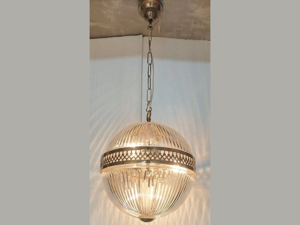 A ribbed glass pendant light embodies the streamlined character that dominated the Art Deco period. The vertical ribs refract light gently across a room, creating a subtle play of illumination similar to early hotel or train-station fixtures. This pendant suits kitchens or hallways where soft, diffused light is preferred.