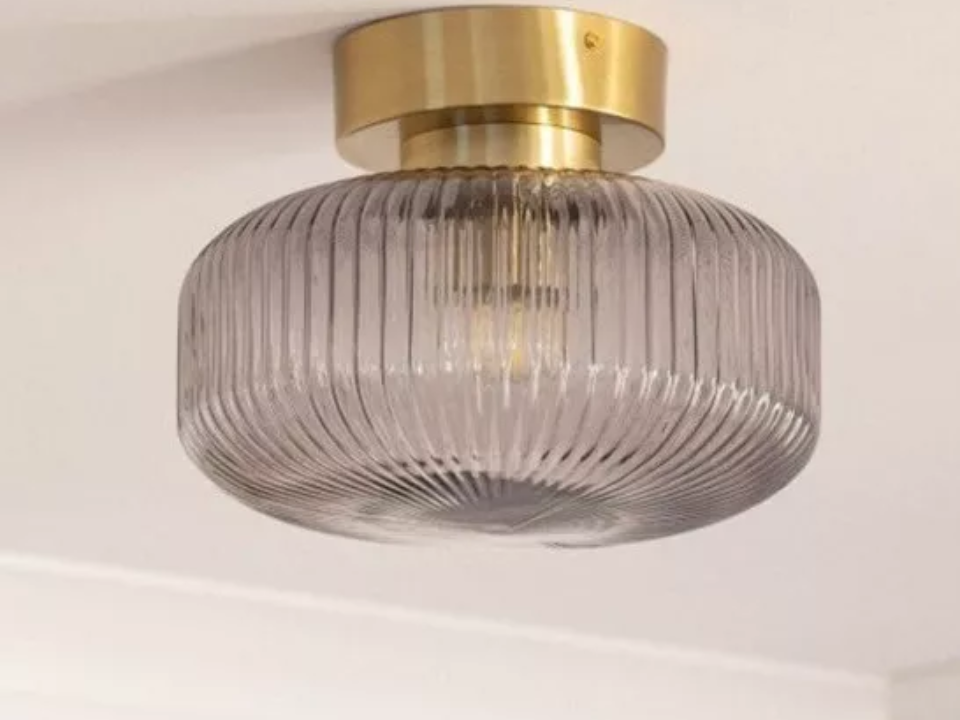 This ceiling lamp offers a design that echoes the symmetry and geometry of 1920s–30s style, with clear glass and brass tone metal framing that reflects the machine-age aesthetic of the era. Its compact size makes it a practical entry piece for someone starting a collection without needing a large budget or huge installation space.
