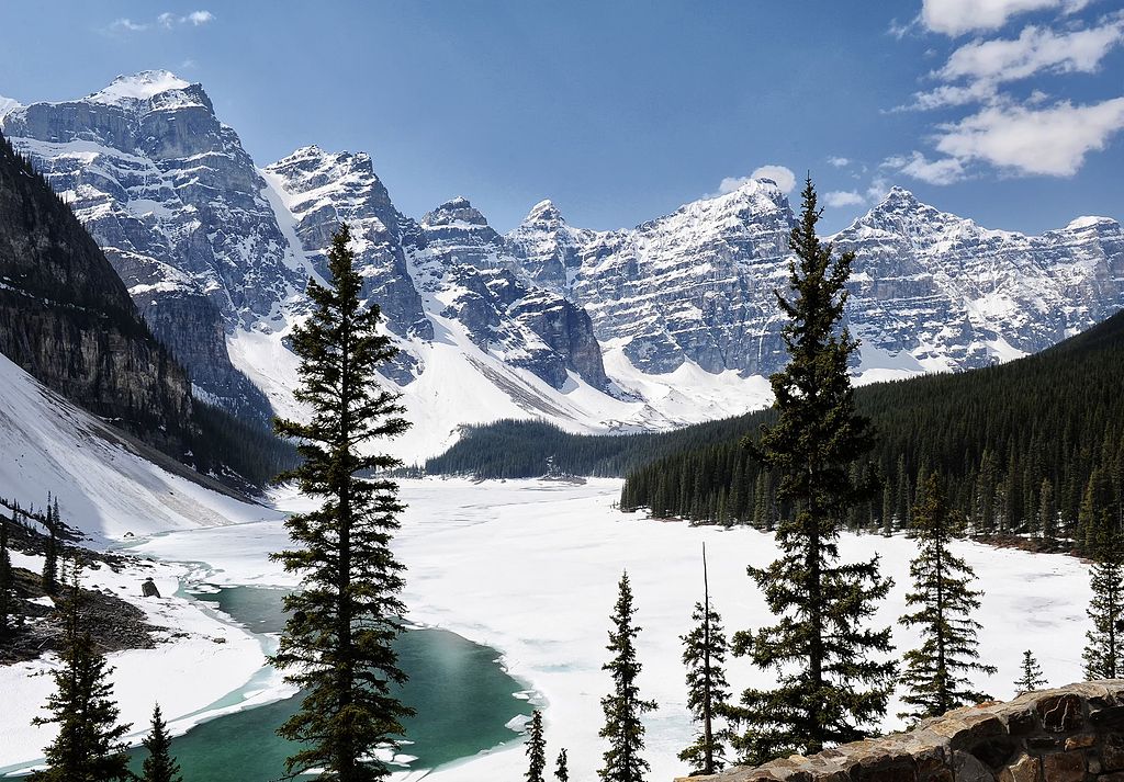 Moraine Lake, nestled in the heart of the Canadian Rockies, is another stunning alpine lake that becomes a frozen beauty during the colder months. The lake’s bright blue waters freeze over, leaving behind a blanket of ice and snow. Surrounded by towering peaks, the scene at sunrise or sunset is breathtaking, as the soft light hits the snow-capped mountains and frozen lake. The stillness of the lake, paired with the towering peaks, creates a picture-perfect view.