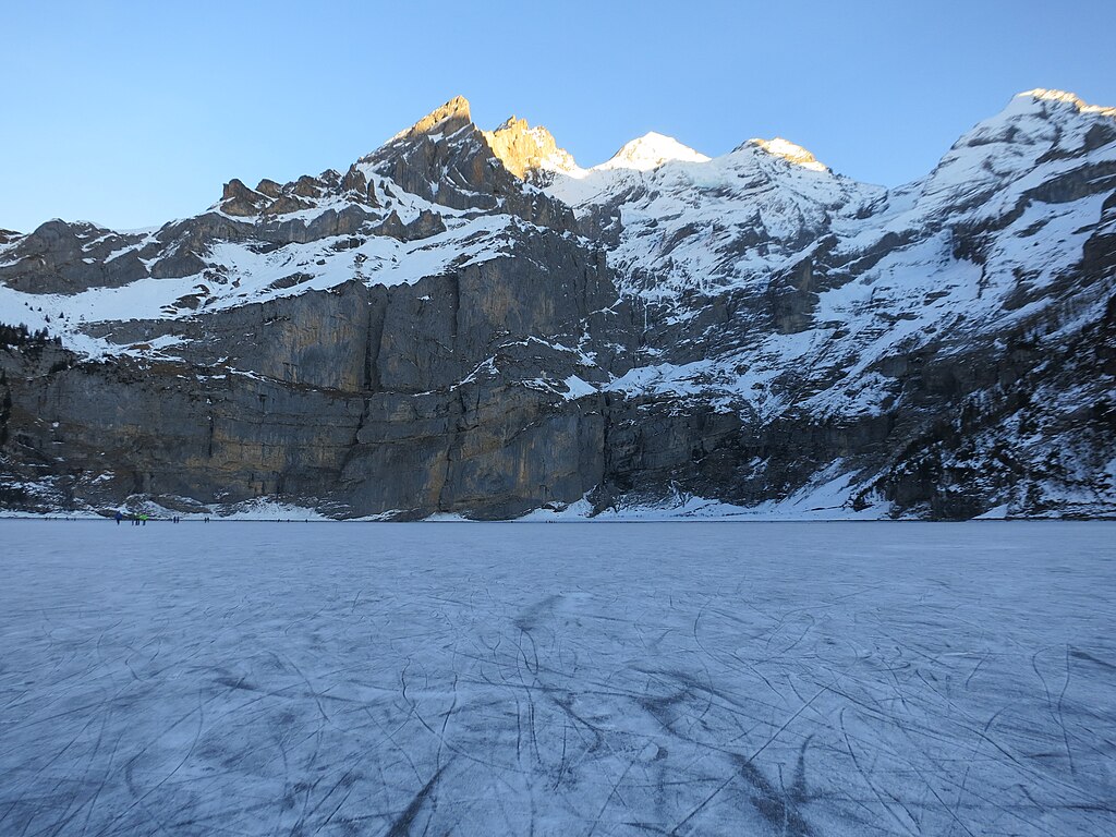 Oeschinensee, located near the Swiss village of Kandersteg, is an alpine lake known for its breathtaking views. Surrounded by snow-capped peaks, the lake freezes over in winter, offering an ethereal sight of ice stretching across the surface. The light at sunrise and sunset casts a golden glow on the frozen waters, creating a magical and almost surreal experience. The reflections of the mountains on the ice add depth and beauty to this already picturesque location.