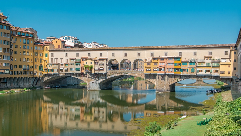 The Ponte Vecchio, or “Old Bridge,” in Florence, Italy, was completed in 1345 and remains one of the most famous bridges in the world. Originally built to replace previous wooden structures, it spans the Arno River and is known for the row of shops built along its span. During the Renaissance, the bridge became a hub for goldsmiths and merchants, a role it continues to fulfill today, although it is more of a tourist attraction now. The bridge’s unique design features three arches, which were built to allow river traffic to pass underneath while also providing a solid foundation for the buildings above.