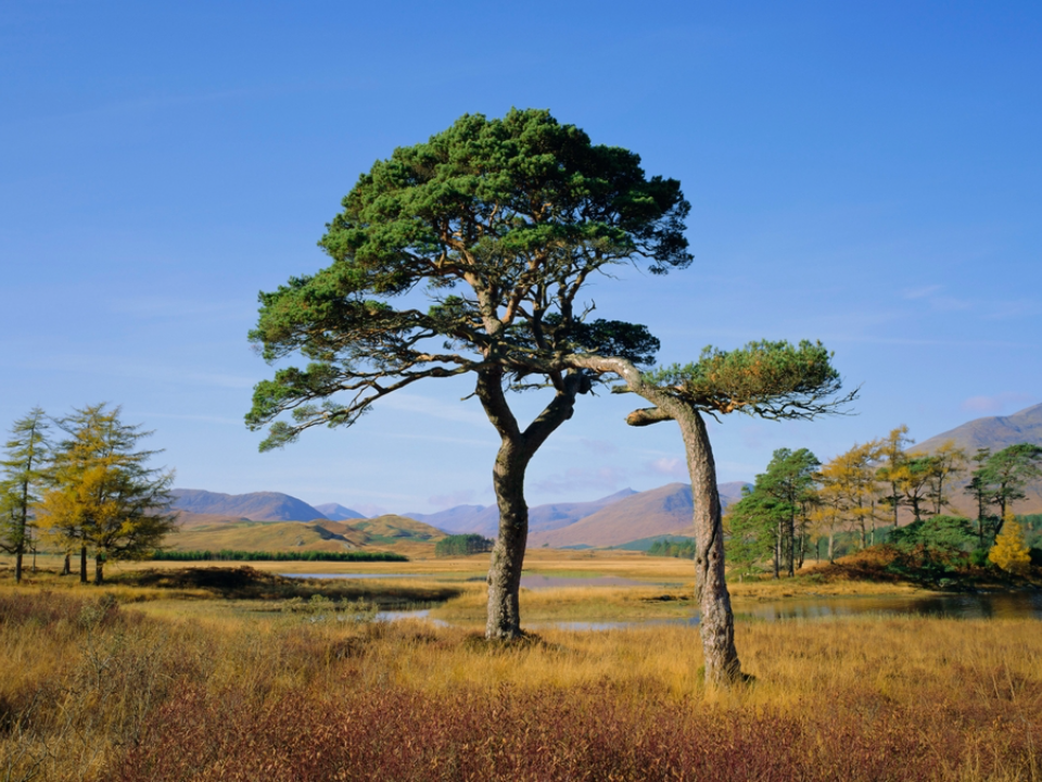The Scots Pine is a long-lived conifer that grows in northern Europe and parts of Asia. These trees are known for their twisted trunks, which develop as the trees grow in response to strong winds and challenging weather conditions. The Scots Pine has a distinctive reddish-brown bark that becomes scaly as the tree matures. This species can live for several hundred years, and it thrives in a variety of climates, from cold northern regions to more temperate zones.