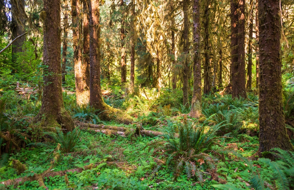 The Hoh Rainforest in Olympic National Park feels like stepping into another world entirely. Draped in thick blankets of moss and lichen, its trees reach extraordinary heights, some stretching over 300 feet. The Sitka spruce and western hemlock dominate the canopy, creating an ecosystem that thrives in near-constant rainfall. The air is cool and damp, filled with the scent of wet earth and decaying wood, giving visitors a feeling of connection to something ancient and enduring.