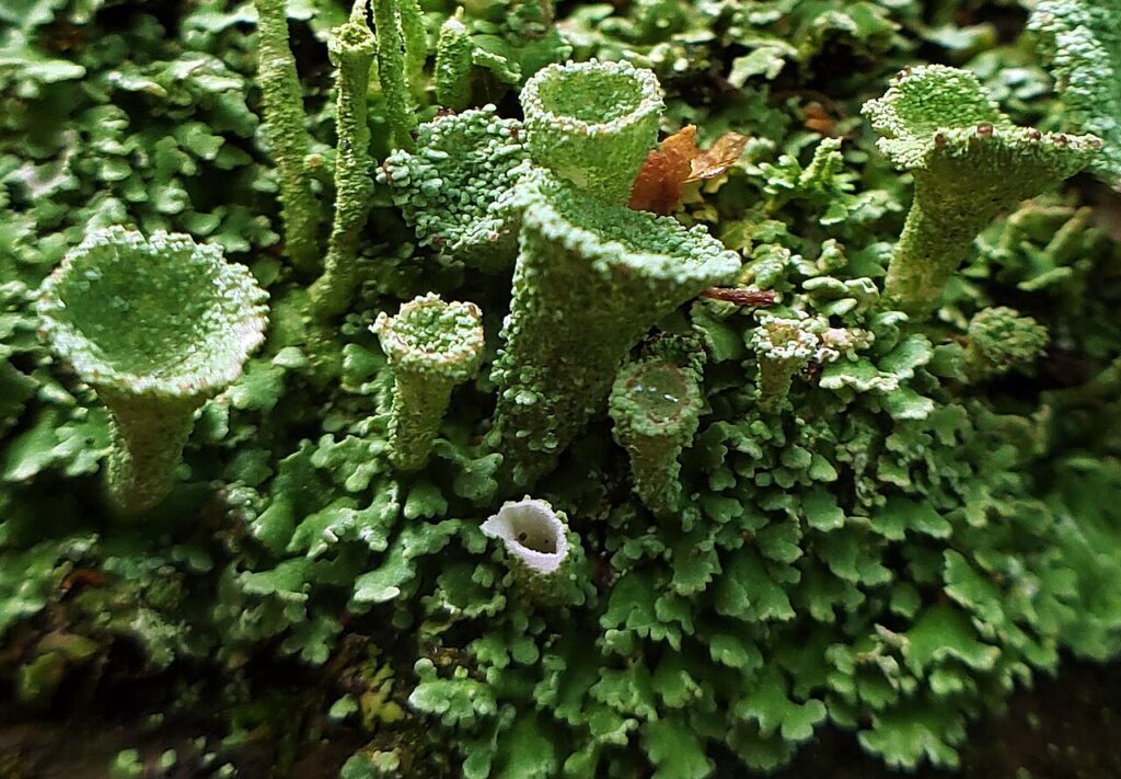 Cladonia pyxidata, or pixie cup lichen, is a small, cup-shaped lichen that thrives in the moist, cool environments of old forests. This lichen grows in colonies, forming a unique structure with tiny cup-like formations that are easily recognizable. Pixie cup lichen is an important part of the forest floor ecosystem, breaking down organic matter and helping to enrich the soil. It’s also a food source for small herbivores and a shelter for tiny creatures like insects and spiders.