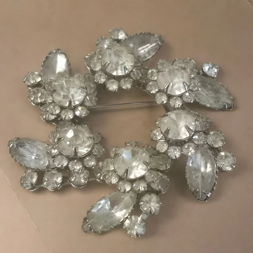 Flip the piece over and look for missing stones, darkened glue, or prongs that no longer grip. Matching stones matter, since odd replacements can look dull or the wrong shade in daylight. Some makers are widely collected, and a signature on the back can add interest, but plenty of unmarked pieces are still worth owning. If the rhinestones still look clear and the metal has not turned rough, the brooch will usually photograph well and wear nicely.