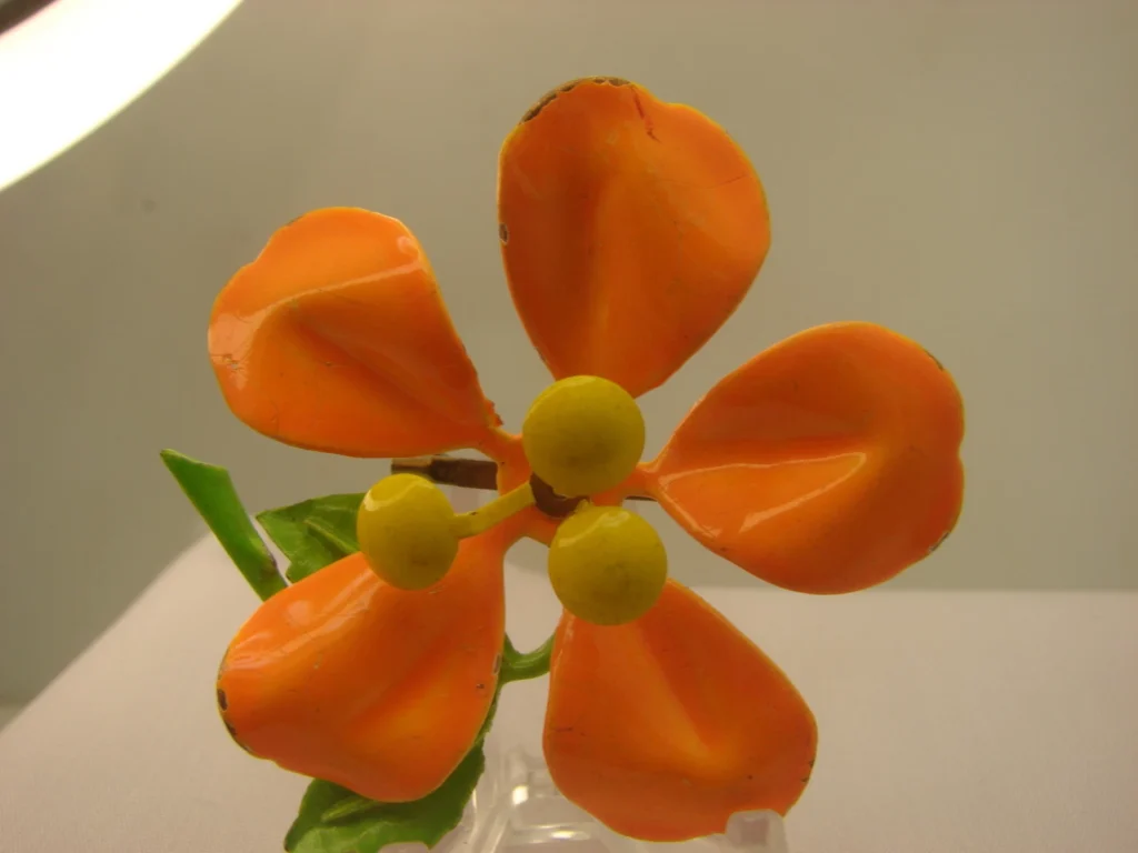 1960s mod pins lean into bright color, simple shapes, and materials that feel cheerful and graphic. Enamel blocks, high gloss finishes, and lucite in bold forms like circles, flowers, and geometric panels are common. Many were costume pieces, but they capture the look of the era so well that collectors still chase them. You can spot them easily because they often feel lighter and more playful than earlier brooch styles.