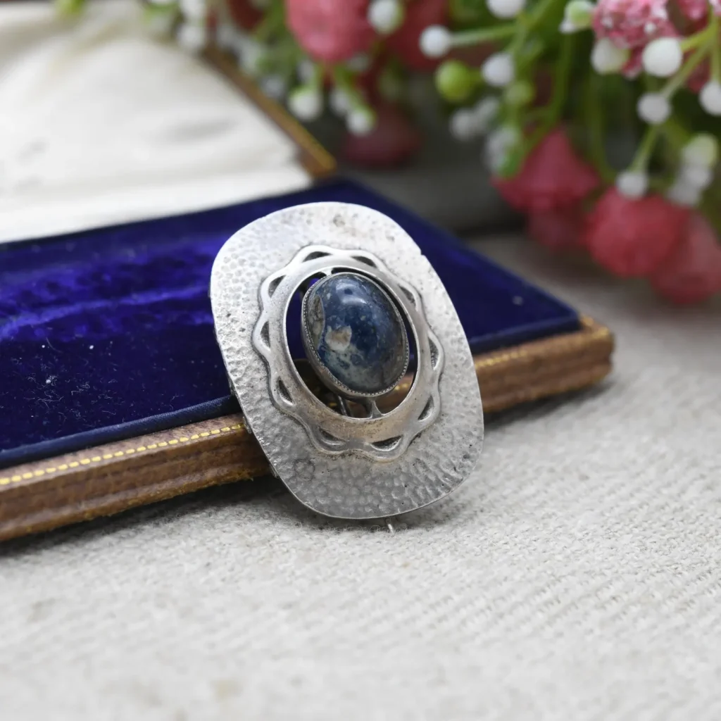 Arts and Crafts Hammered Silver and Cabochon Stone Brooches