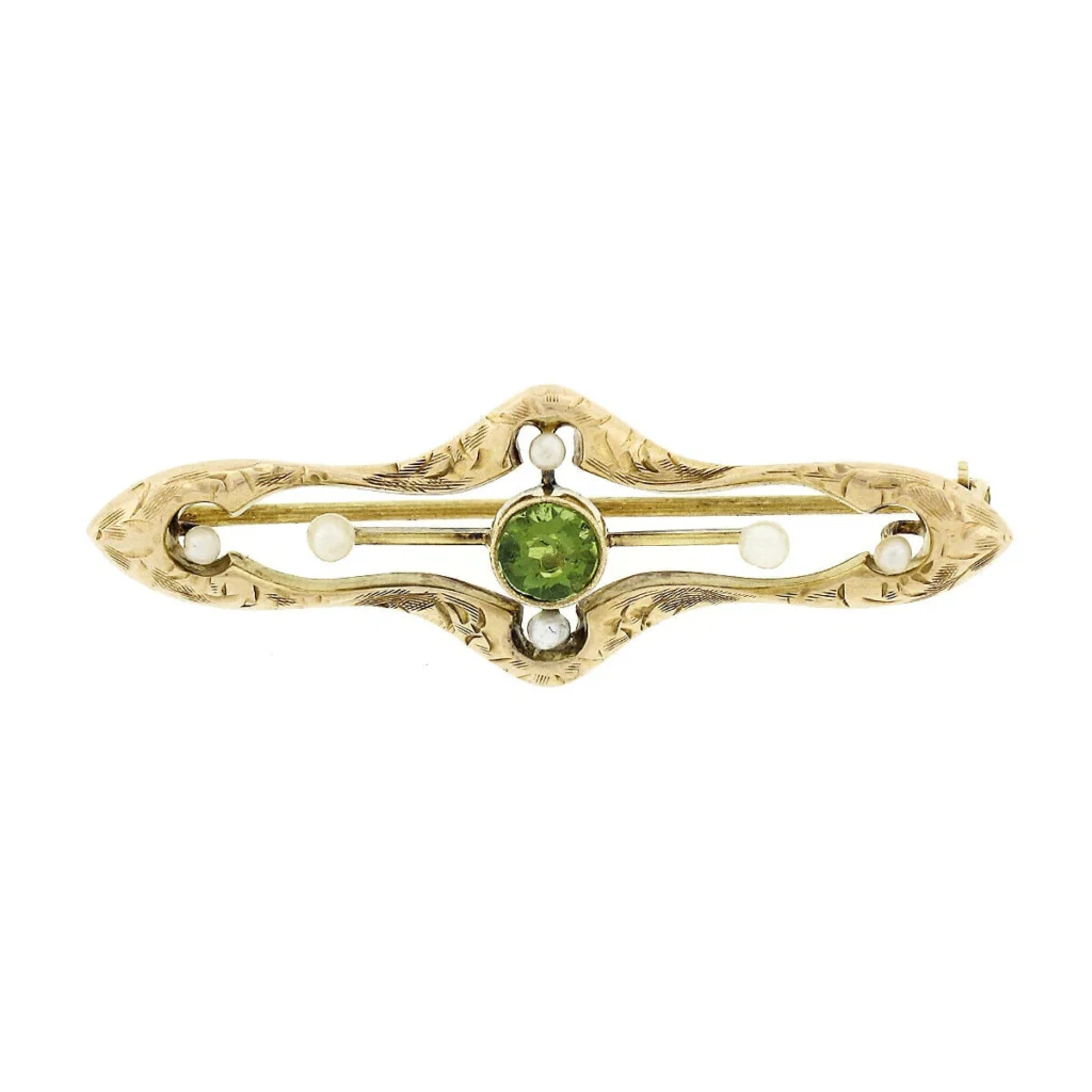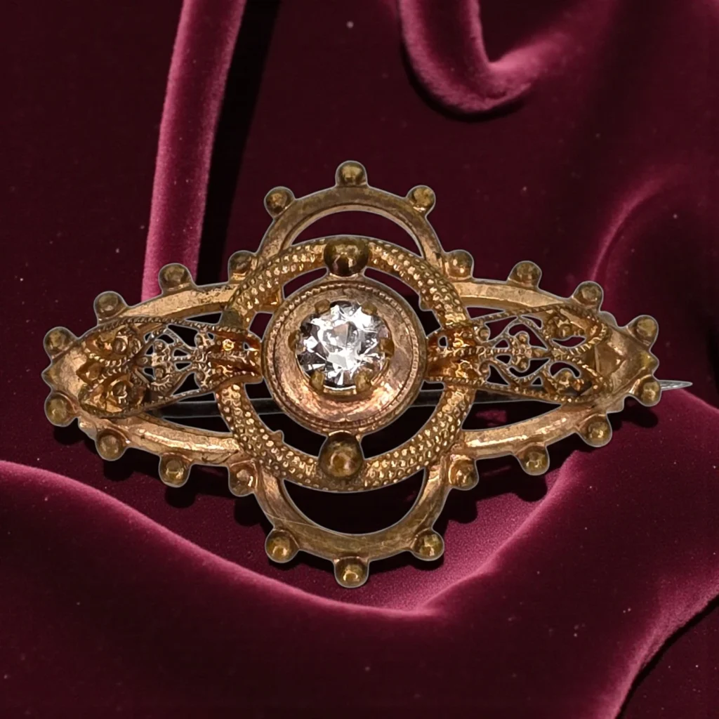 Etruscan Revival pins mimic ancient gold work, so they often feature tiny bead patterns, rope borders, and raised textures. Many examples use granulation and filigree-like details that look very fine even when the piece is small. You might spot classical motifs like amphora shapes, shields, or little panels that look like they belong on a museum piece. The gold can be rich yellow, and sometimes it is a lower karat that still wears beautifully.