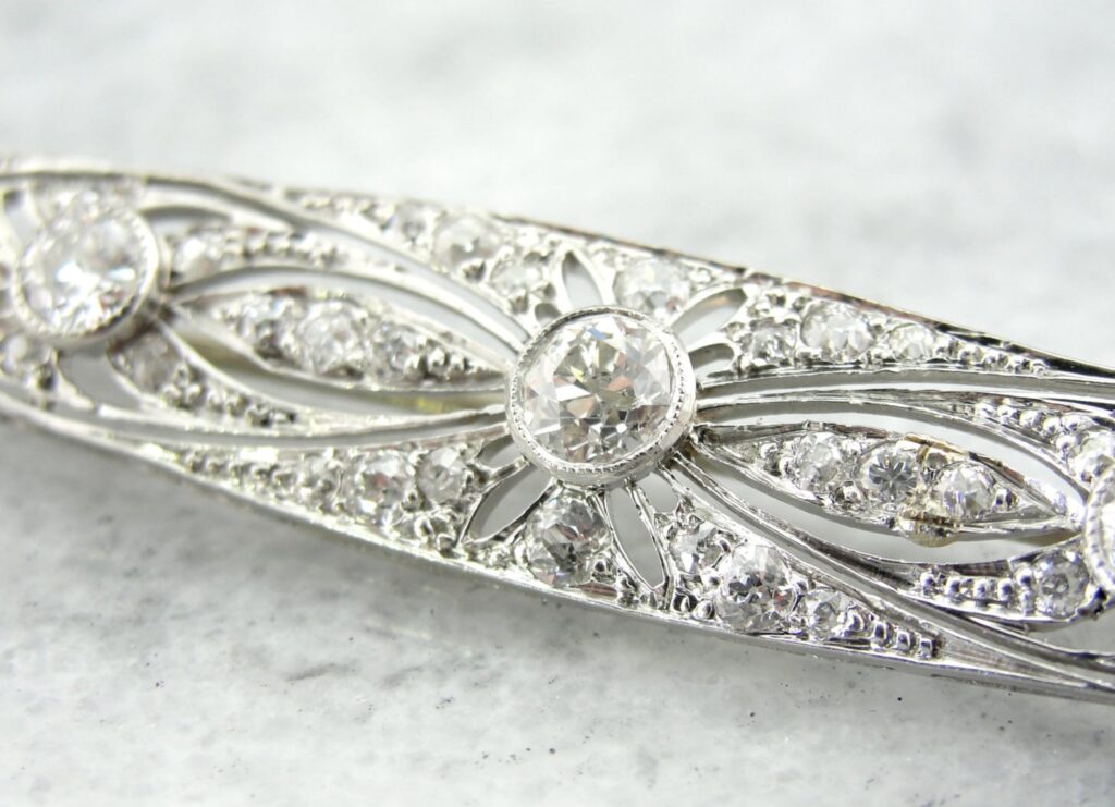 Edwardian bar pins are slim and refined, often made to sit neatly on a collar or lapel. Platinum was popular because it allowed delicate settings that still held diamonds securely, so you will see airy openwork and tiny milgrain edges. Many feature old-cut diamonds in a line, a bow shape, or a small center motif like a leaf or star. The overall look is crisp and light, which makes these pins surprisingly easy to wear today.