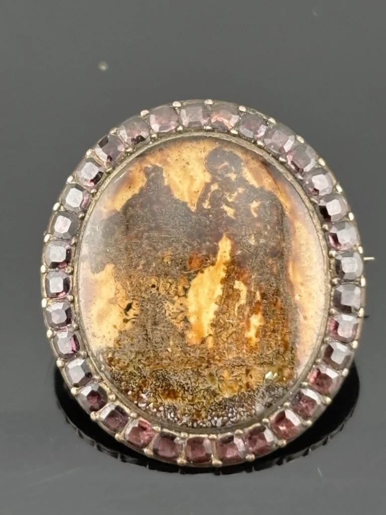 Georgian mourning brooches are often tied to grief rituals, so they tend to feel personal and carefully made. Many include woven hairwork under glass, sometimes arranged in braids, loops, or tiny plaits that form a pattern. You might also see initials, dates, or small symbols like urns and weeping willows worked into the design. The frames can be gold, pinchbeck, or silver, and the overall look is usually quiet and dark.