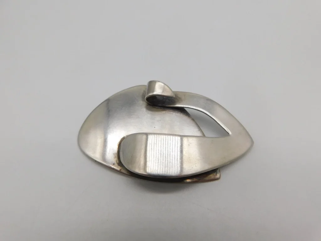 Mid-century modern sterling brooches often lean into abstract shapes, clean lines, and a sculptural feel. You might see sweeping curves, leaf-like forms, or open circles that look simple but intentional. Many were made in the 1950s and 1960s, and you will often find maker marks on the back, especially from studio jewelers. The silver may be matte, brushed, or lightly hammered, which gives it texture without stones.
