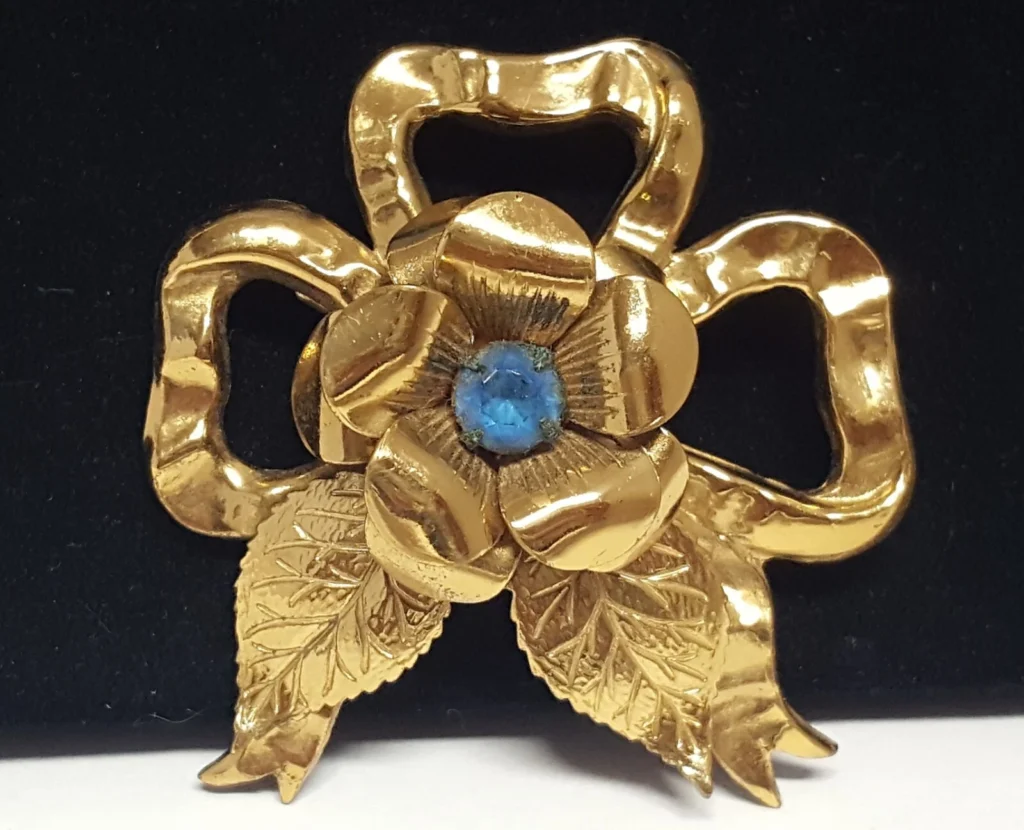 Retro era brooches from the 1940s often feel big, confident, and a little playful. Common shapes include bows, ribbons, sprays of flowers, and scrolling metal that looks almost like fabric. Yellow and rose gold were popular, and you will see ribbed textures and chunky forms that reflect the style of the time. Many were made to stand out on a suit jacket or dress, so they often have strong presence even without stones.