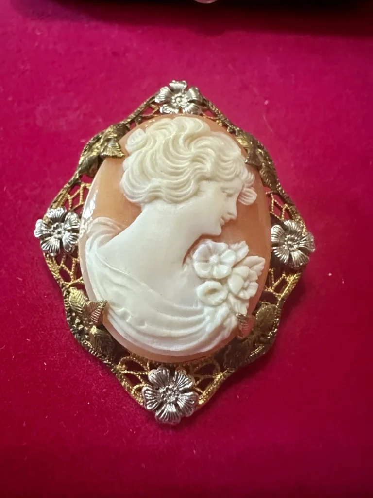 Turn the brooch slightly in the light and you can often see tool marks or carving lines, especially on older pieces. Shell can crack if dropped, so check the edges and the nose area, which are common weak spots. Lava is porous and can chip, but it also has a distinctive texture that collectors like when it is intact. If the portrait looks sharp and balanced, the cameo usually reads as higher quality, even without a fancy setting.