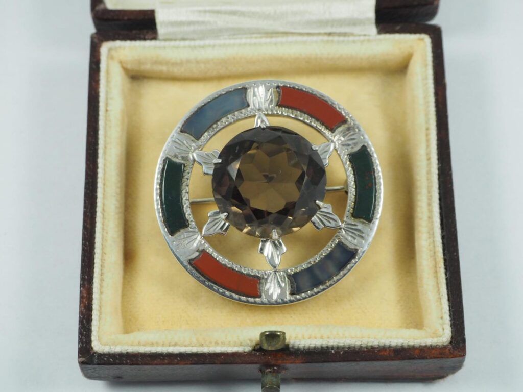 Scottish agate brooches, sometimes called pebble brooches, are all about the stones and the bold color blocks. You will often see banded agate, jasper, bloodstone, or cairngorm glass set into circles, ovals, or star shapes. Many are in silver or silver plate, and the stones tend to be polished smooth with a slightly domed top. The look is sturdy and outdoorsy, which fits their popularity in the Victorian era.