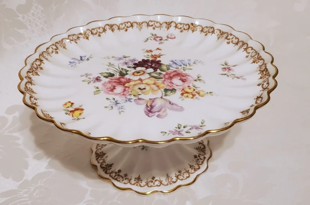 A cake stand or compote made from antique china gives you instant height, which is one of the easiest ways to improve a flat display. The raised base helps smaller pieces around it look more intentional because your eye moves up and down across the arrangement. Decorative rims, painted flowers, and gold trim can make even a simple corner table feel dressed up. It is a nice option when you want something pretty that still feels useful.