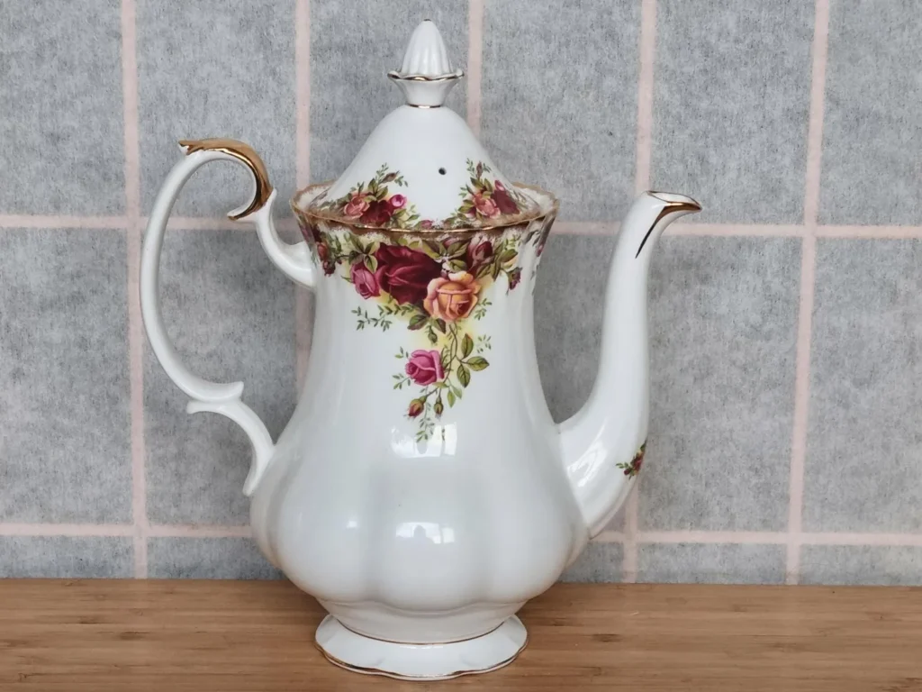 You can place a coffee pot at the back of a shelf and let smaller cups or creamers sit in front without hiding it completely. On a dining room sideboard, it pairs nicely with candlesticks and a stack of dessert plates for a simple vintage setup. If the lid is loose, many people still display it by setting the lid beside the pot so nothing gets damaged. It is one of those pieces that looks polished without much effort.