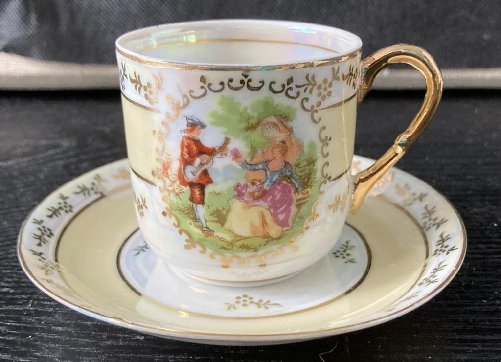 Try placing it on a shelf beside stacked linens or old cookbooks where the shape can really stand out. The underplate helps it feel complete, and that makes the pair look more finished than a single loose piece. Some people tuck one into a kitchen vignette with a sugar bowl and creamer for a collected look. Even when it is tiny, it adds personality and a little movement to the shelf line.