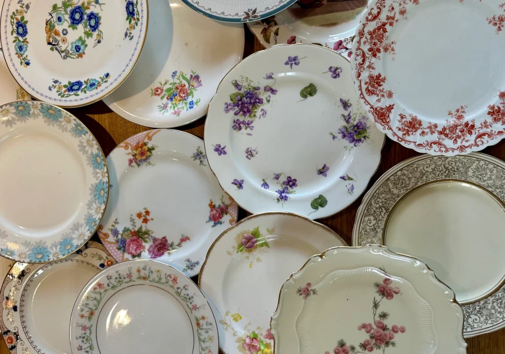 Mixed antique china dessert plates are popular for display because they add pattern right away without the cost of collecting full sets. When the colors relate to each other, the different prints look layered and personal rather than messy. Smaller dessert plates are also easier to hang on a wall than heavy dinner plates, so they are great for gallery-style arrangements. A few worn edges usually blend in once the plates are grouped together.