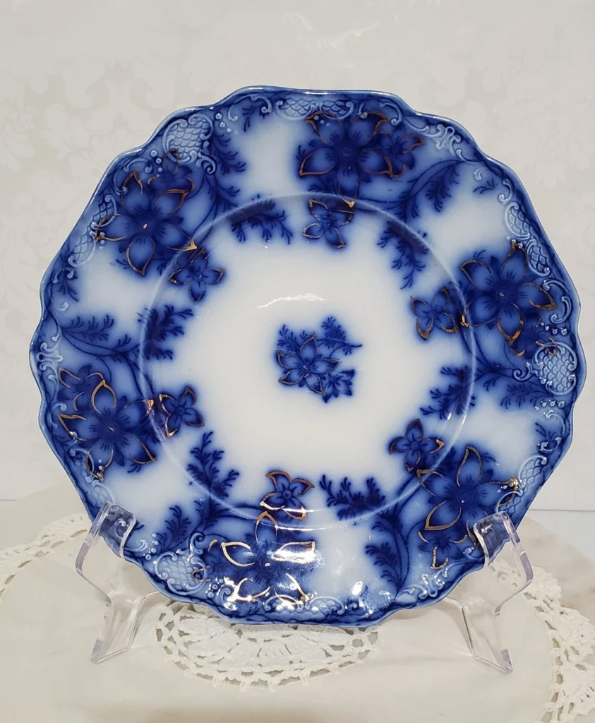 Flow Blue plates are easy to spot because the pattern edges look soft and slightly blurred, which gives them a moody look that feels older right away. A stack of them adds height and color without taking up much room, so they work well on shelves that are not very deep. The worn rims and little marks many old plates have can make the stack look more interesting than a set in perfect condition. Mixed shades of blue in one stack can look better than trying to match every plate exactly.