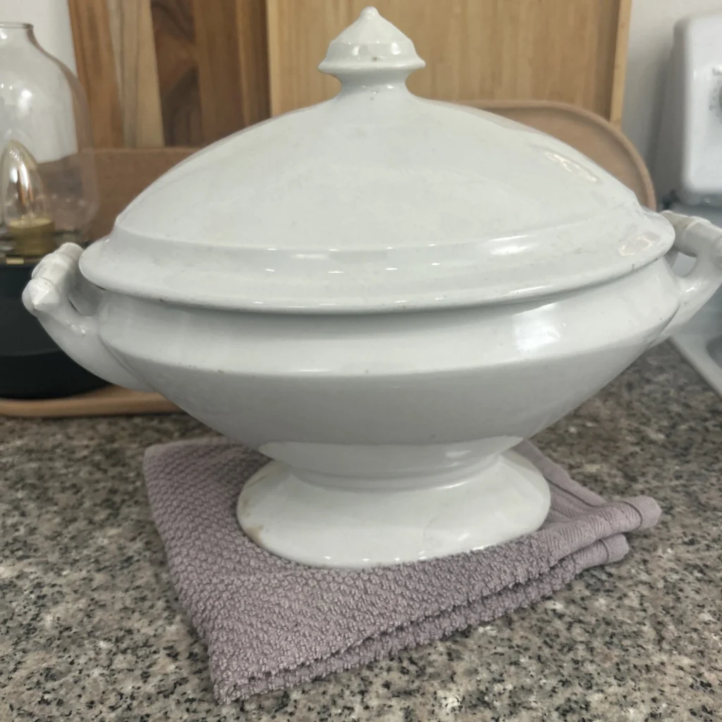 This kind of piece looks great centered on a sideboard, especially with a few smaller items around it. You can leave the lid on for a clean silhouette, or set the lid beside it to show more detail and make the setup feel less formal. In kitchens, many people use a tureen as a display anchor near cookbooks, cutting boards, and old utensils. It brings a useful old-house feeling without needing a lot of styling.