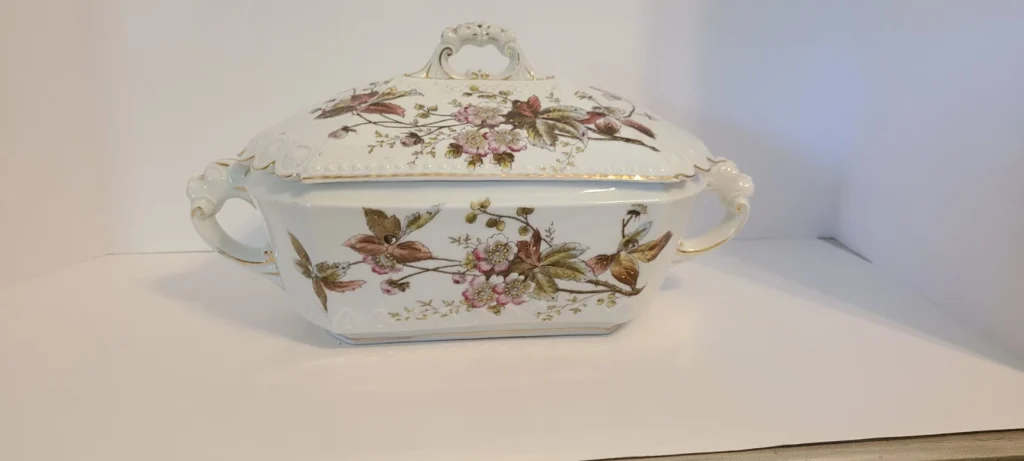 A covered vegetable dish has a useful low shape that sits nicely in the middle of a shelf without blocking everything behind it. Transferware versions are especially nice for display because the lid and base both carry pattern, so you get detail from every angle. The side handles add width and make the piece feel substantial even when it is not very tall. It is one of those antiques that looks good in a dining room but can also work in a kitchen or entry cabinet.