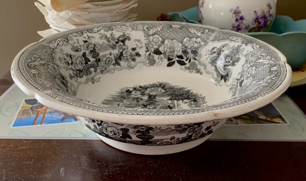 A transferware wash basin bowl is a large piece that can fill a shelf or tabletop in one move, which makes decorating a lot easier. The wide shape shows off border patterns really well, especially when the bowl is displayed at a slight angle. Because these bowls were made for daily use, they often have a sturdy feel that works nicely in casual rooms. Blue transfer prints are common, though brown and red versions can look beautiful too.