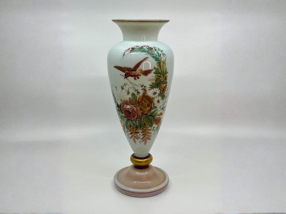 Victorian Bristol Glass Vases, which were made in England during the late 1800s, are known for their delicate milky appearance and soft, satin finish. These vases often feature hand-painted floral designs that were popular during the Victorian era. The market price for these vases can range from $1,000 to $5,000, depending on size and the quality of the design. The soft, ethereal quality of the glass makes these vases highly desirable to collectors.