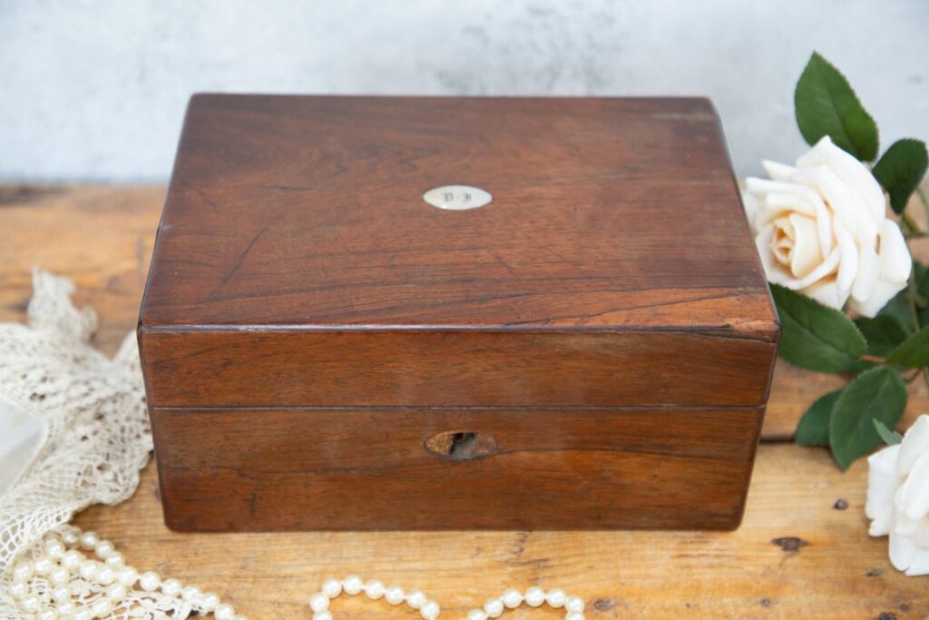 Putting this piece on a dresser or vanity adds both a practical storage option and a note of elegance that feels personal. People often look for boxes with original lining and functioning locks because these details reflect age without abuse. A light polish can bring out the grain in the wood without removing the aged surface. When paired with a vintage mirror or brush set, it feels like stepping into a well-cared-for room from the past.