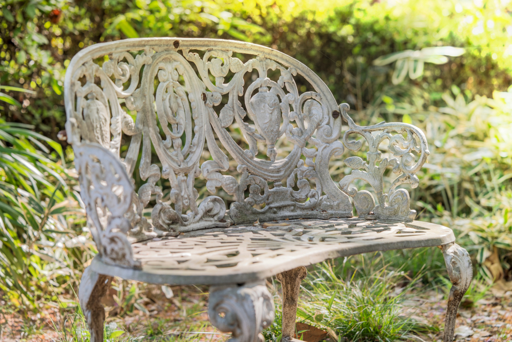 An antique wrought iron garden bench can add an aged garden charm to patios or sunrooms with its strong lines and weathered finish. Many were made in the early 1900s when outdoor furniture favored heavy metal with scrolling patterns. The key feature is the sturdy iron lattice work that can support multiple people and hold climbing vines or cushions. In the current market, these benches often sit between $300 and $800, depending on size and condition of the ironwork.