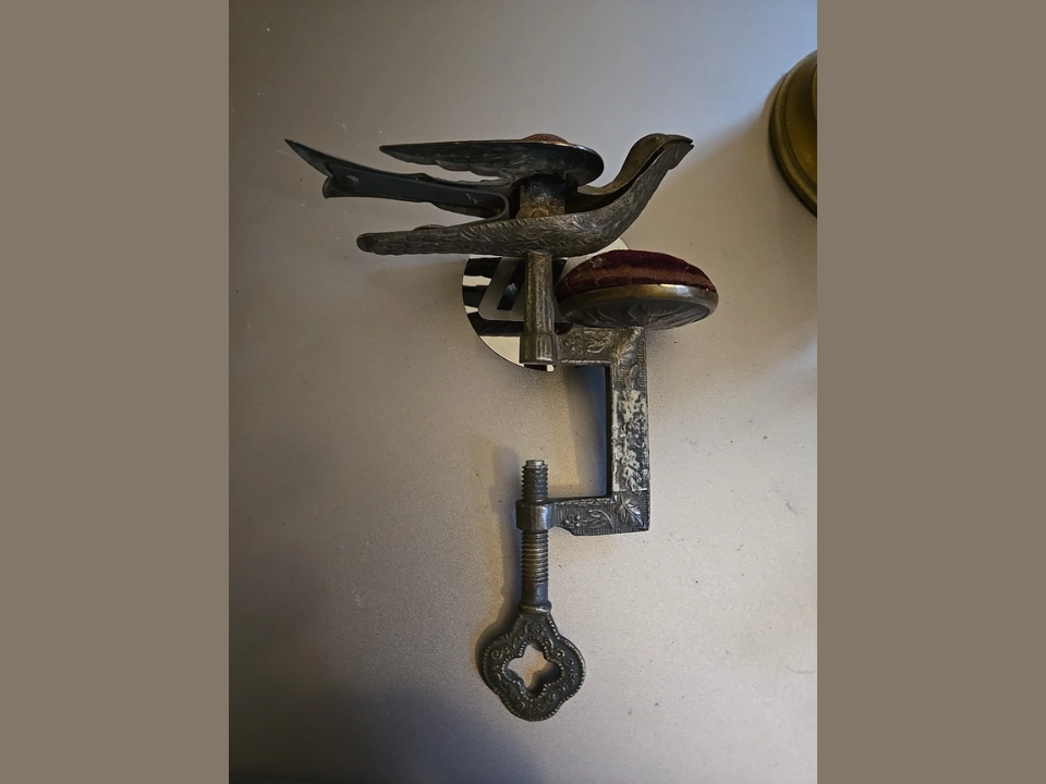 A figural brass bird clamp pincushion combines whimsical design with practicality. The bird-shaped clamp attaches to a table edge, and its tail holds a pincushion, making it both a functional sewing tool and an eye-catching decorative object. These pincushions were popular in the late 19th century and often feature intricate detailing, which enhances their collectability.