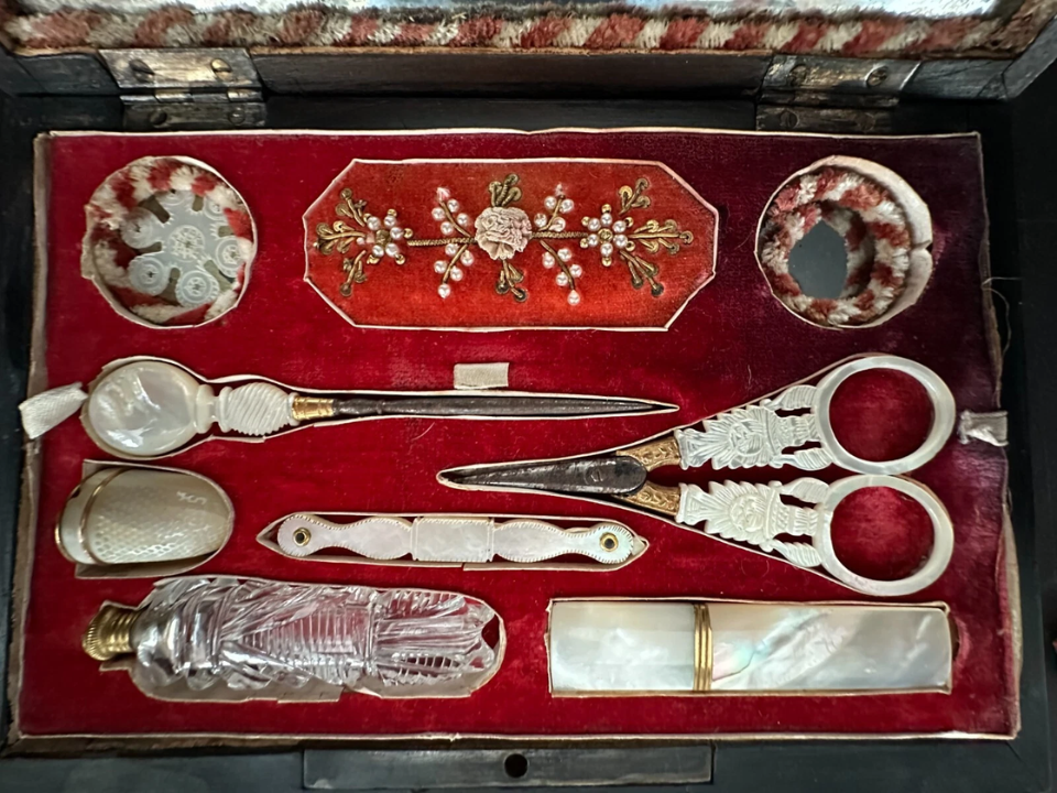 A Palais-Royal sewing kit, housed in a mother-of-pearl case, was the epitome of luxury in the early 19th century. These kits typically contain small, exquisitely made sewing tools such as scissors, a thimble, a needle case, and sometimes even a pin cushion. The mother-of-pearl exterior, often delicately carved, combined with the fine tools inside, made these sets a desirable item among the elite.