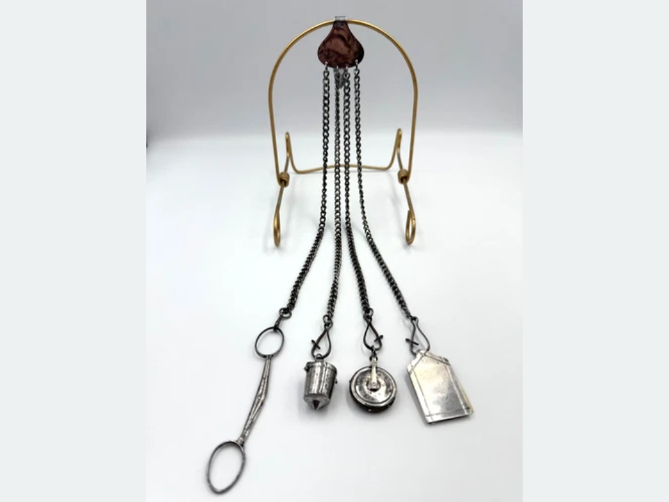 A chatelaine sewing set, often worn on the waist, features a chain that holds small, essential tools like scissors, a needle case, and a thimble. The silver-plated versions are prized for their elegance, with the chain often adorned with detailed designs or engraved initials. These sets were designed for convenience and style, allowing seamstresses to carry their tools easily while on the move.