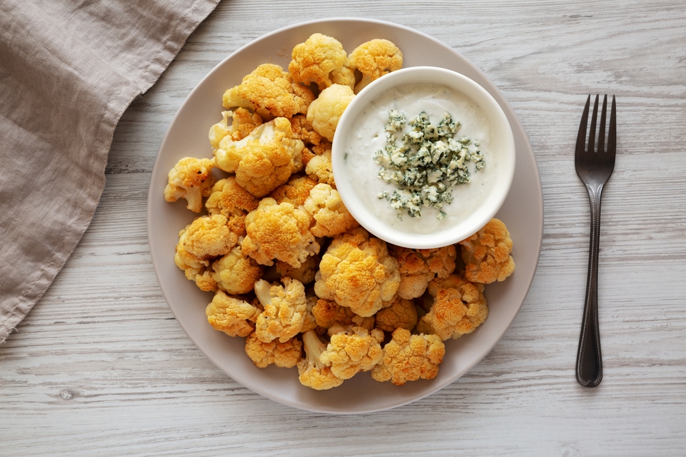 For this dish, you will need 1 head of cauliflower, one-half cup buffalo sauce, 1 tablespoon olive oil, and salt and pepper to taste. Preheat the oven to 400 degrees Fahrenheit (200 degrees Celsius). Toss the cauliflower florets with olive oil, salt, pepper, and buffalo sauce. Spread them out on a baking sheet and bake for 25-30 minutes, flipping halfway through, until crispy. Serve with ranch or blue cheese dressing for dipping.