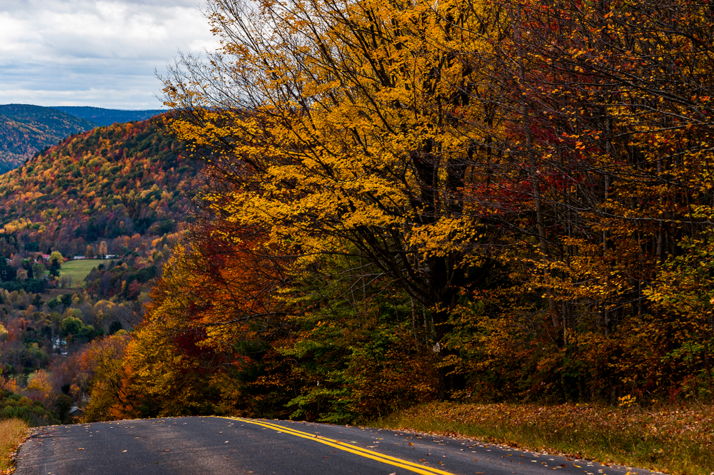 Route 100 stretches for about 216 miles through the heart of Vermont. Driving the entire road takes about five hours, though most travelers stop often to take in the scenery. October is peak foliage season in Vermont, and this route is known as one of the best for leaf peeping. Rolling hills, covered bridges, and small towns add to its charm. The drive is especially striking with mountain ridges glowing in orange and red.