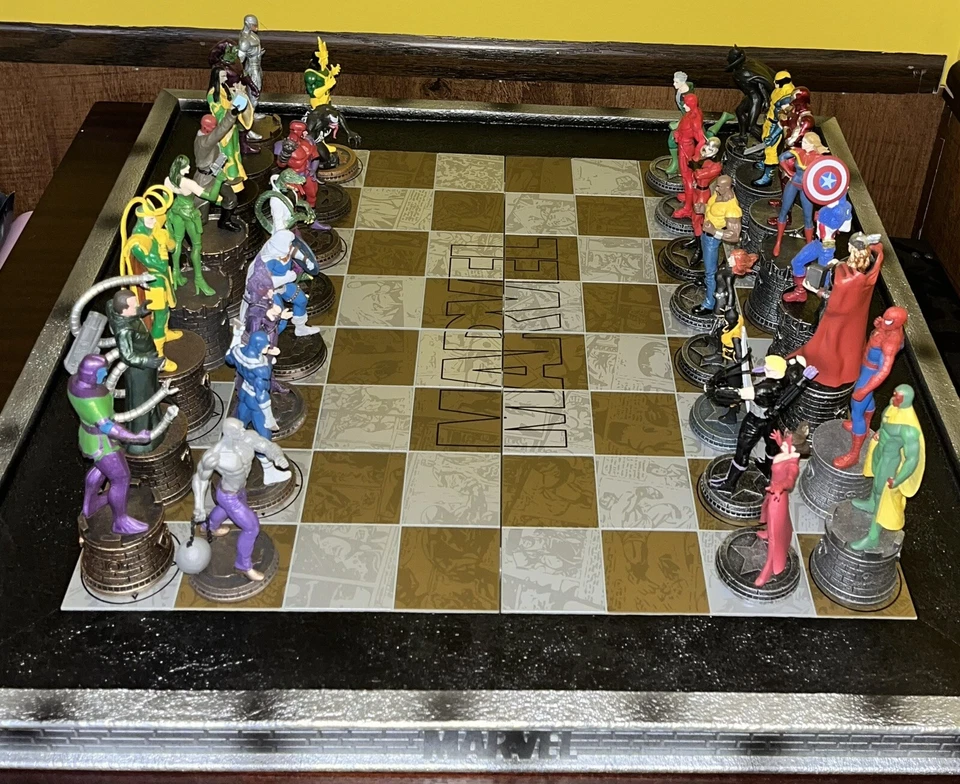 Released by the Franklin Mint, the Marvel Legends Chess Set features Marvel characters as chess pieces, including Spider-Man, Captain America, and Wolverine. The set allows players to engage in a classic game of chess while controlling their favorite Marvel heroes and villains. The pieces are intricately detailed and hand-painted, making it both a functional chess set and a collectible item. This set is valued between $150 and $250, depending on condition and the presence of all pieces.