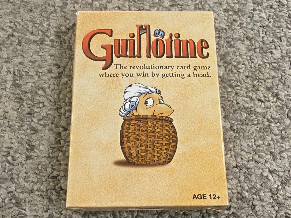Guillotine is a card game set during the French Revolution, where players must execute nobles. The rules of the game are strange because players must line up the nobles in a specific order to execute them, but can manipulate the line to their advantage. The game has a dark sense of humor, with players trying to collect the most valuable heads.