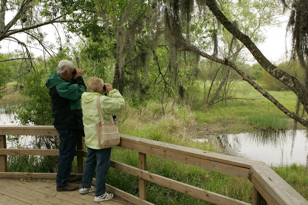 Sabine’s coastal marshes fill with ducks, ibis, and shorebirds when winter winds ease, and more water flows in from inland lakes. Boardwalks rise above tidal flats where birds probe for food and allow watchers to stand in the midst of wide sky and distant wings without trudging through mud. Elevated platforms give sweeping views over salt marsh channels that bend like ribbons in the lowland.
