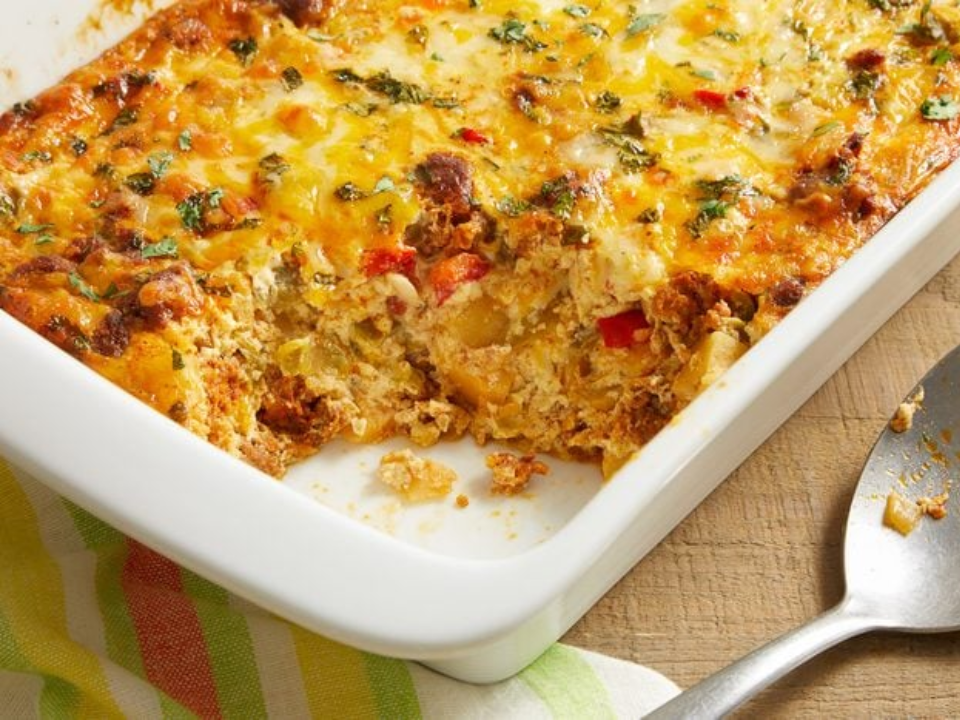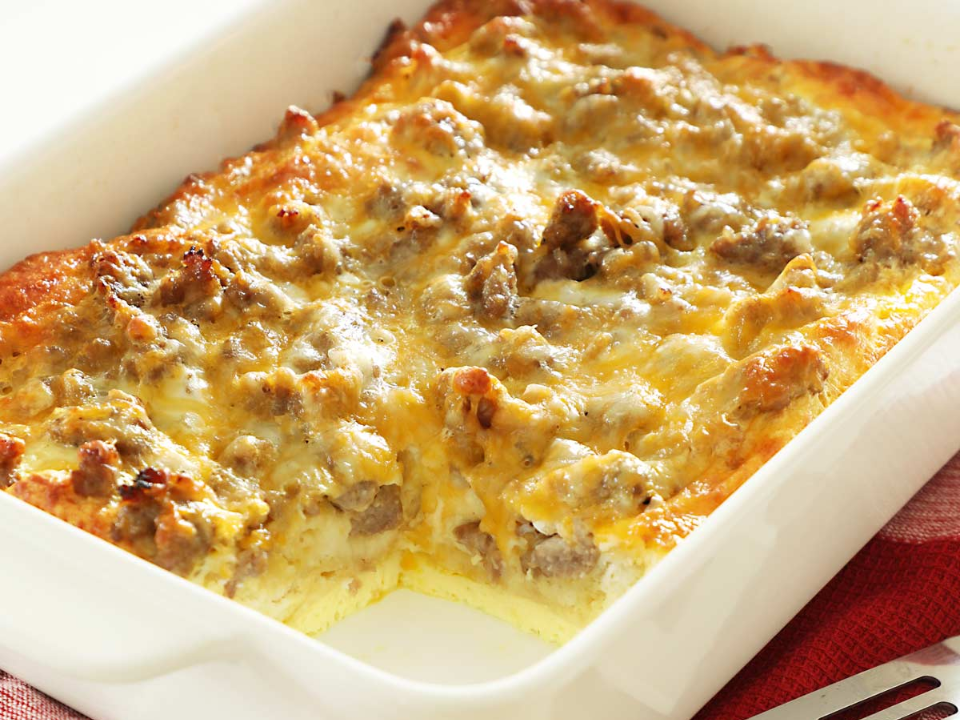 You’ll need 8 large eggs, 1 pound of cooked sausage (crumbled), 1 can of refrigerated biscuit dough (cut into quarters), 1 cup of shredded cheddar cheese, and one-half cup of milk. Preheat the oven to 350 degrees Fahrenheit and grease a 9×13-inch baking dish. Layer the sausage and biscuit pieces in the dish, then pour the egg mixture over the top. Bake for 30-40 minutes, or until the eggs are fully set and golden brown.