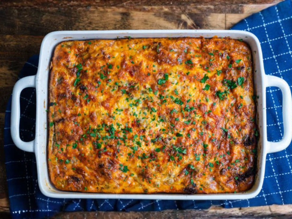You’ll need 4 cups of frozen hash browns (thawed), 8 large eggs, 1 cup of cooked bacon or sausage (crumbled), 1 cup of shredded cheddar cheese, one-half cup of milk, and one-fourth teaspoon of salt. Preheat your oven to 350 degrees Fahrenheit. In a greased baking dish, layer the hash browns, protein, and cheese. Whisk together the eggs, milk, and salt, then pour over the casserole. Bake for 40-45 minutes, or until the eggs are set and golden brown on top.
