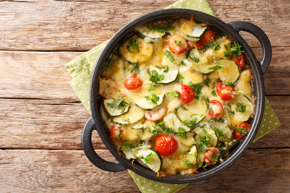 Gather 8 large eggs, 1 zucchini (sliced), 1 cup of diced tomatoes, 1 cup of shredded mozzarella cheese, and one-fourth cup of milk. Preheat the oven to 350 degrees Fahrenheit and grease a baking dish. Layer the zucchini, tomatoes, and cheese in the dish. Whisk together the eggs, milk, and salt, then pour over the vegetables. Bake for 30-35 minutes, or until set.