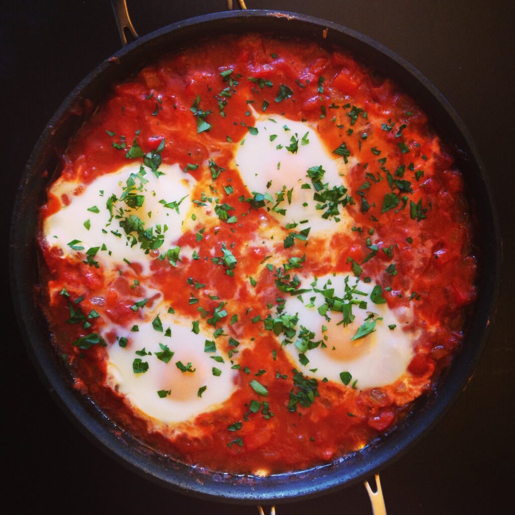 Heat the tomato sauce in a pan and add garlic, letting it cook until fragrant. Make small spaces in the sauce and crack the eggs directly into them. Cover the pan and cook until the eggs are set but still soft in the center. Season with salt, pepper, and herbs. Serve warm with bread on the side.