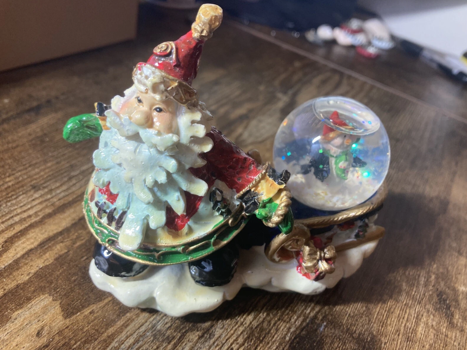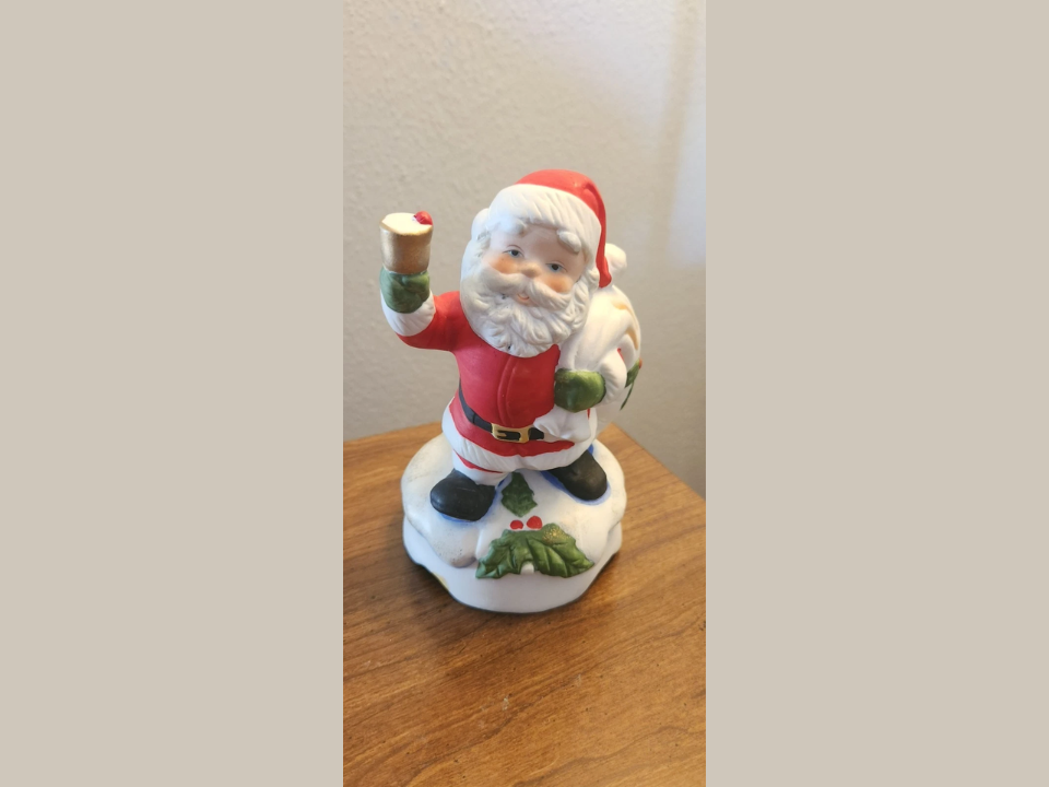 This collectible features Santa standing atop a ceramic base that houses a small wind‑up music box. When wound the base plays a festive tune commonly associated with Christmas. The figure often involves delicate details like a small toy or bell in Santa’s hand. These pieces were popular in the 1980s and 1990s when musical decorations gained popularity for holiday homes.