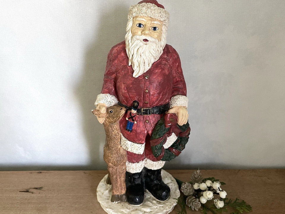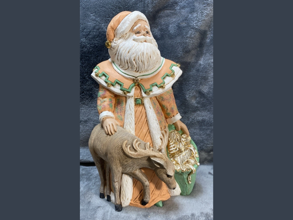 This collectible depicts Santa standing tall while a small reindeer rests at his feet, looking up trustingly. The reindeer is usually sculpted with delicate antlers and subtle painted details that show care in design. Because the pair suggests companionship it appeals to collectors who enjoy storytelling pieces rather than simple decorative figures.