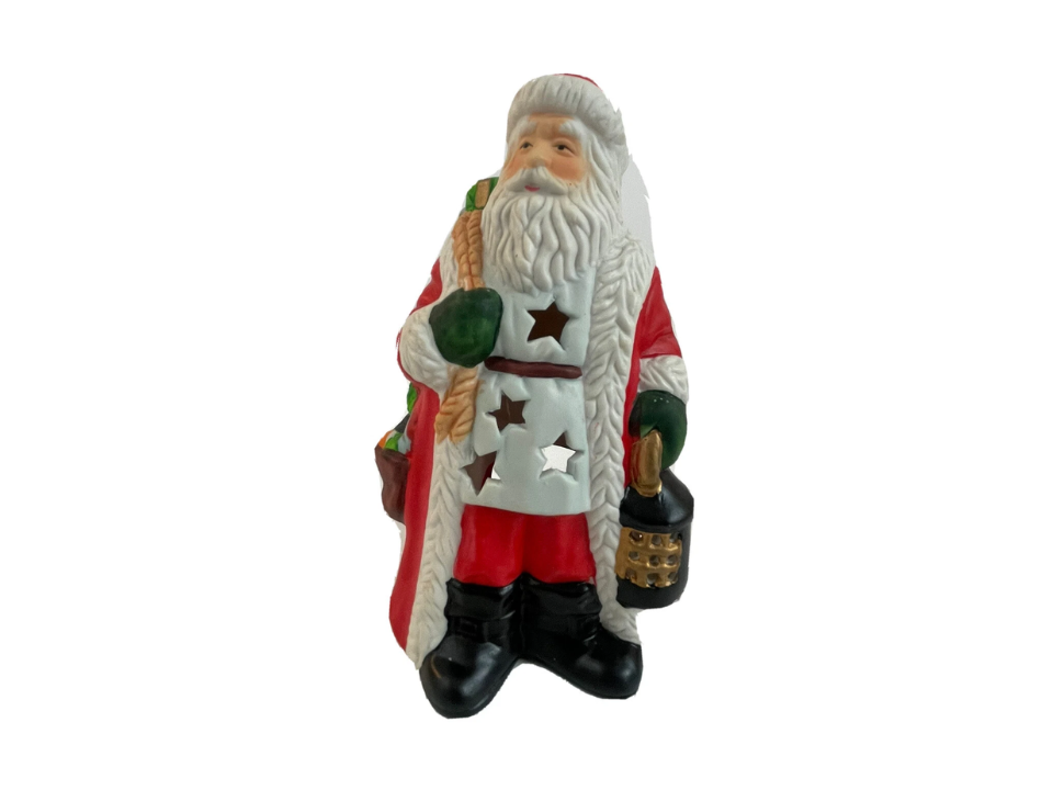 This version of Santa carries a small ceramic lantern in one hand giving the figure a gentle glow if fitted with a tea light or electric bulb. The lantern often has star or snowflake cutouts that project shapes when lit. The overall design tends to suggest Santa guiding his way through a snowy night delivering gifts.