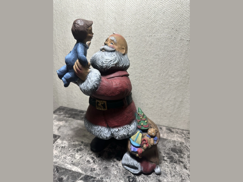 This version shows Santa holding a small child suggesting a gentle and caring Santa narrative rather than jolly gift‑giver alone. The facial features of Santa often show a soft kindly expression appealing to buyers who prefer emotional depth in holiday décor. Pieces like this appeared in limited runs during the 1970s and remain sought after because they feel more intimate and family oriented.