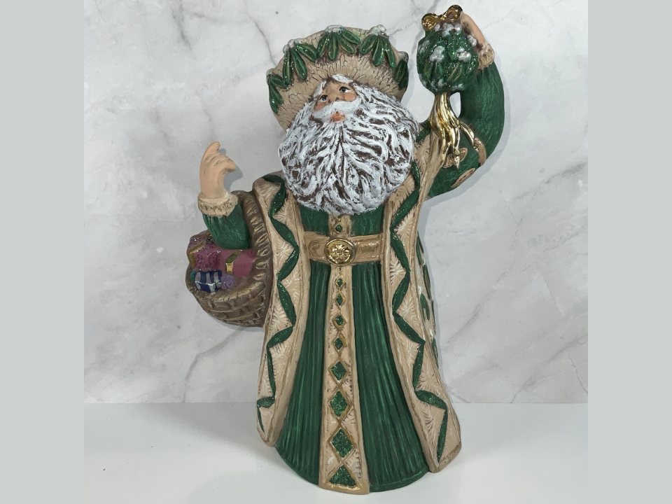 This Santa reflects classical European depiction of St Nicholas. He tends to wear a longer robe rather than a coat and sometimes holds a small bag of coal or apples to reflect tradition. The style often includes a tall pointed hat or a hooded robe hood and a friendly face with long hair and beard. Collectors who appreciate traditional folklore versions of Santa find these pieces appealing especially during winter holidays.