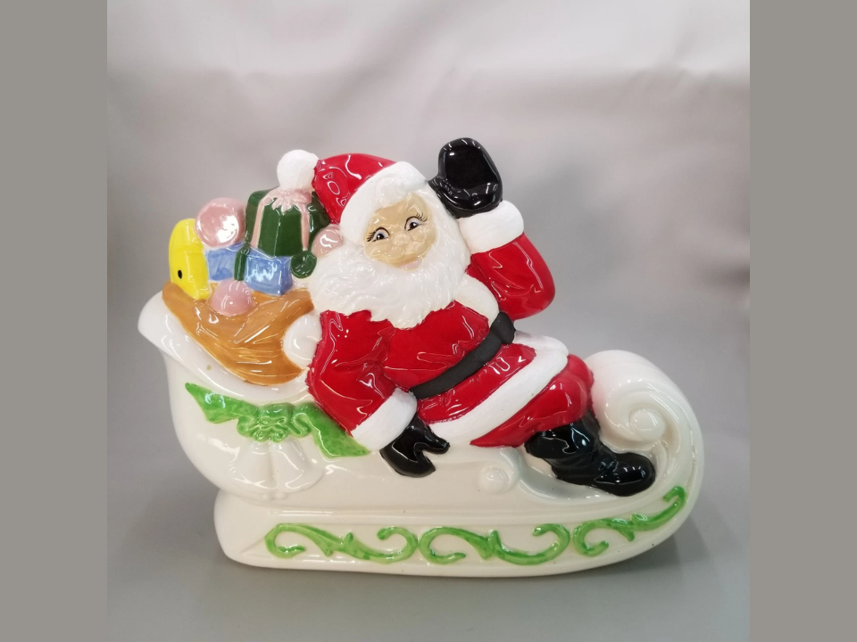 This variant ties together multiple elements associated with Santa lore in one piece giving it a dramatic holiday presence for mantel or table display. First produced in the late 1980s this design became a favorite among families wanting a more elaborate centerpiece. A piece in good condition generally sells around $130. If the sleigh or gift sack shows chips or glaze crazing the value goes down.