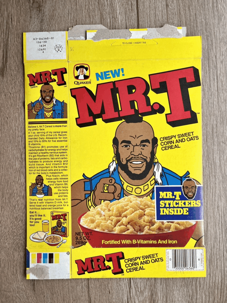 Collectors are drawn to Mr. T Cereal because of its connection to the popular TV star and the fun, kid-friendly product. The cereal’s design and branding made it stand out from others on the shelf at the time. It is highly collectible today, especially in unopened or mint-condition boxes, with some selling for around $100 to $150. The nostalgic value of owning a piece of 1980s pop culture has made Mr. T Cereal a lasting collectible. For those who appreciate unique marketing and 1980s nostalgia, this cereal box is a must-have item.