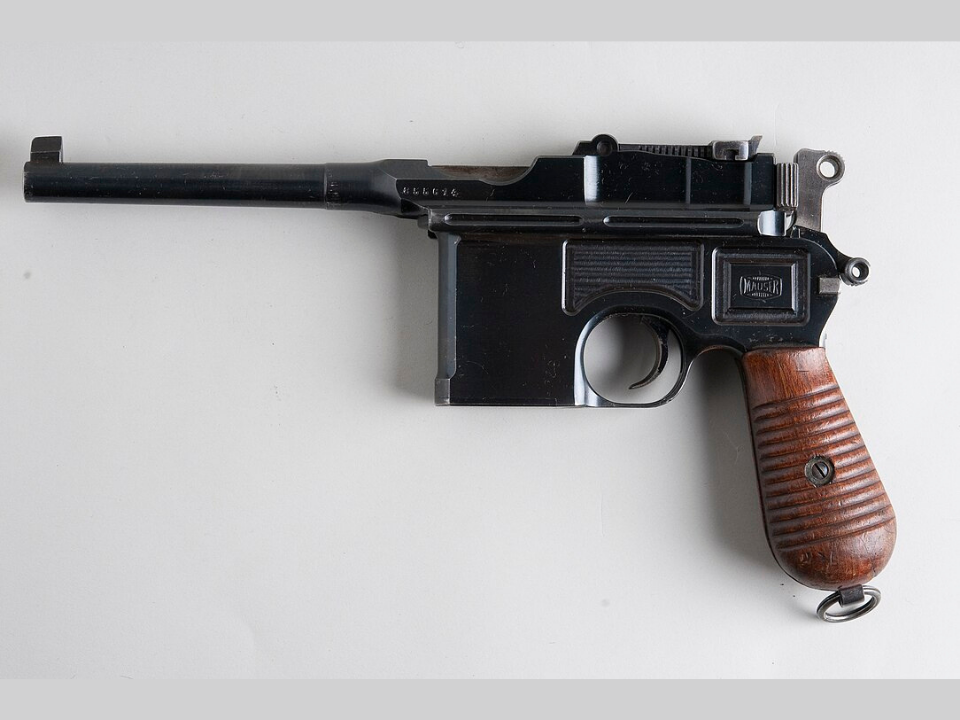 The Mauser C96 earned its nickname from its wooden grip that resembled a broom handle. Produced from 1896 to the late 1930s, it became one of the first successful semi-automatic pistols available to civilians. Its internal box magazine and unique silhouette made it stand out in an era dominated by revolvers.